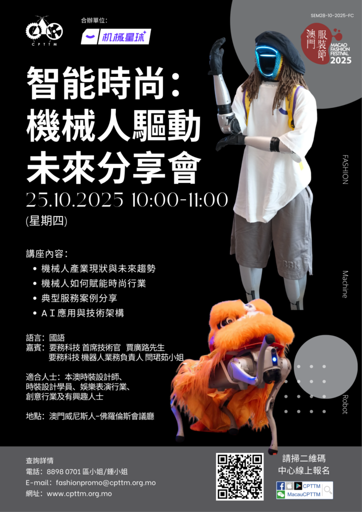 澳門生產力暨科技轉移中心 > 最新消息 > Uncategorized > 2025.10.25 – 智能時尚:機械人驅動未來分享會