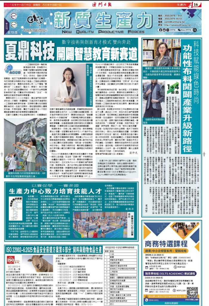 第705期新質生產力 【最新一期】第705期澳門日報新質生產力半月刊內容: – 【企業專訪】夏鼎科技開闢智慧教育新賽道 – 【1+4動態】功能性布料開闢產業升級新路徑 – 【焦點速遞】生產力中心致力培育技能人才 – 【ISO發佈】ISO 22002-6:2025食品安全前提方案第6部分:飼料與動物食品生產 – 商務特選課程 文章連結:https://www.macaodaily.com/html/2025-11/20/node_144.htm 分類 ECM 生產力論壇 最近更新於 2025-11-20. ← 生產力中心出席2025世界服裝大會 (2025.11.19 新聞稿) → 澳時尚品牌新系列亮相深圳原創時裝周 拓展大灣區市場 (2025.11.20 新聞稿)