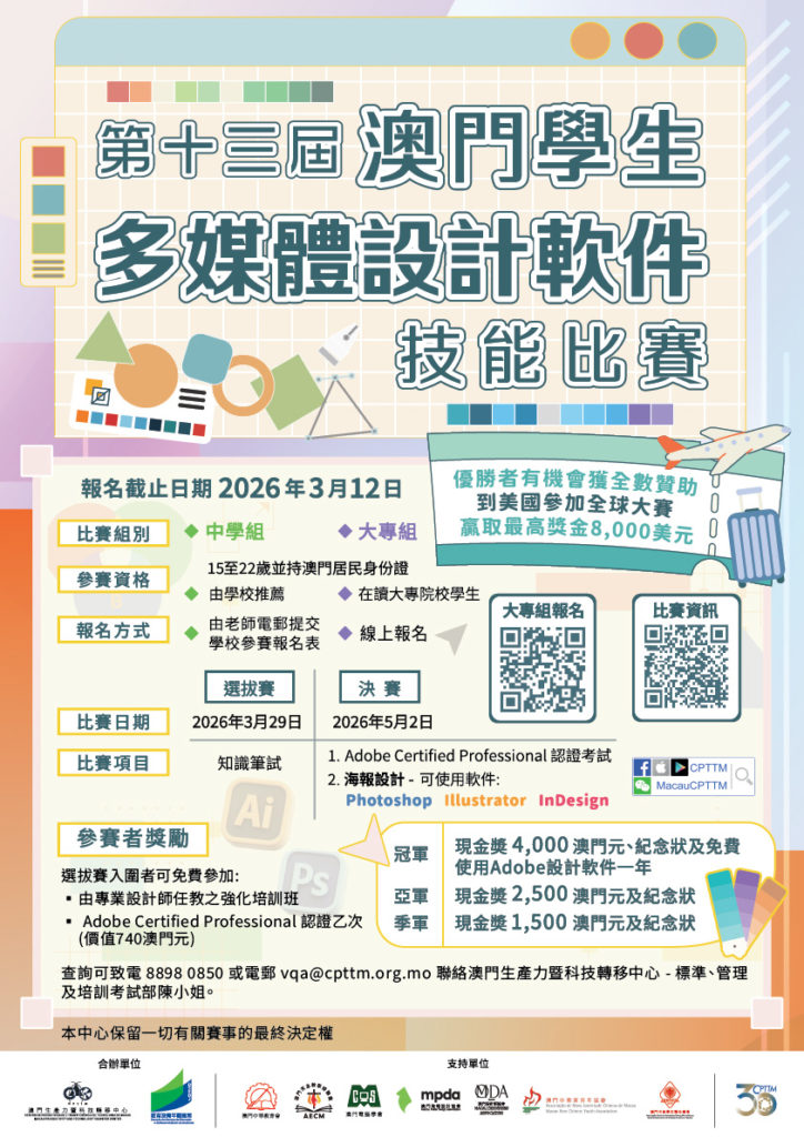 比賽現已接受報名,截止日期為2026年3月12日。報名或了解詳情可瀏覽中心活動網頁(https://www.cpttm.org.mo/smta/events/competition)或於辦公時間內致電專業考試資源中心