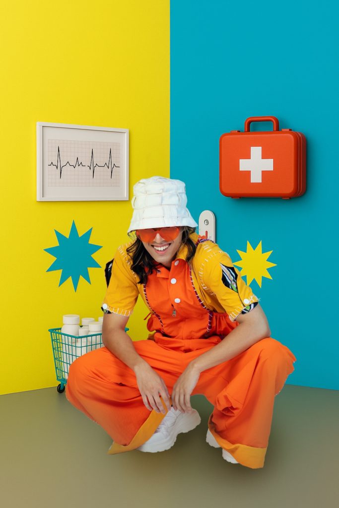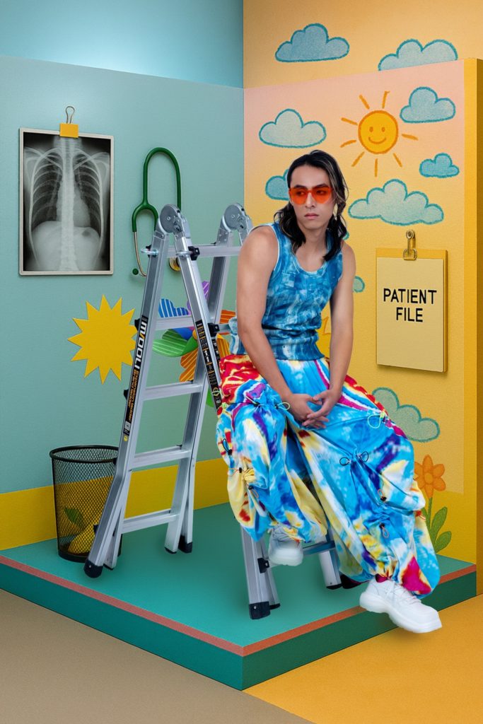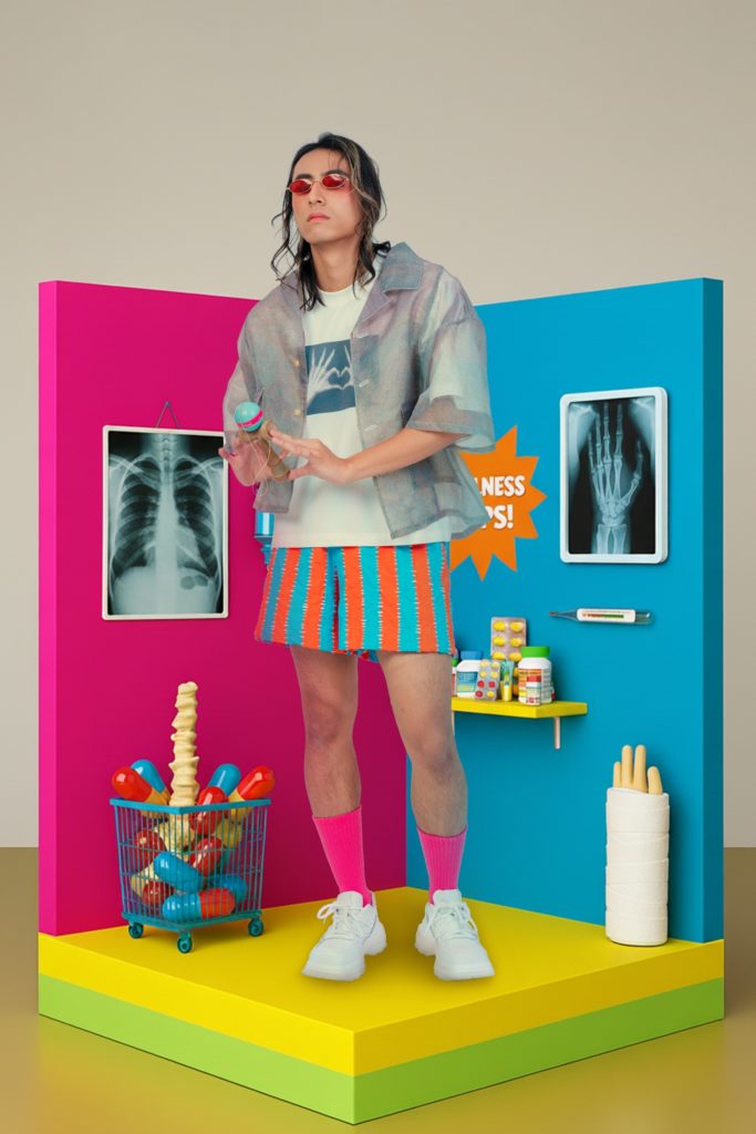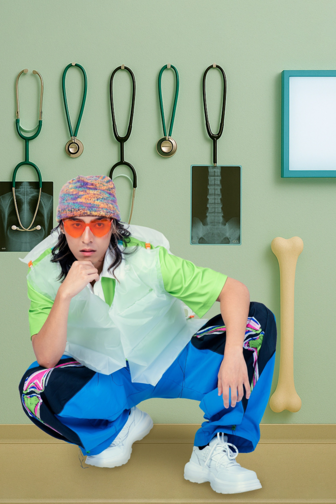 This collection’s theme is “Back Pain.” It draws inspiration from a medical check-up, transforming an initially anxiety-inducing result into a humorous interpretation of X-ray imagery. The collection uses vivid colors to break the clinical coldness of medical settings, combining digital printing, weaving, and hand-stitching to amplify the playfulness of texture and structure. Through contrasting and mixing diverse materials, it creates a light yet dynamic atmosphere, offering a new perspective—approaching life’s small pain points with ease and wit.